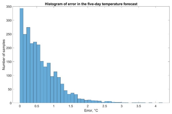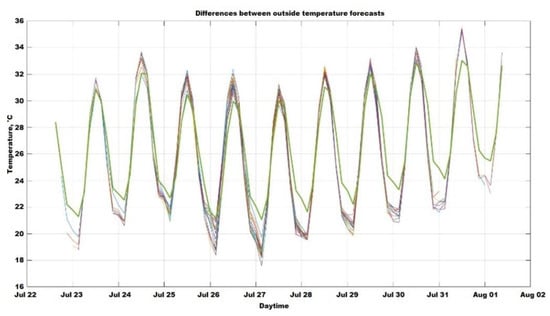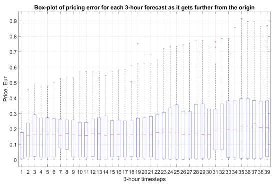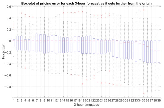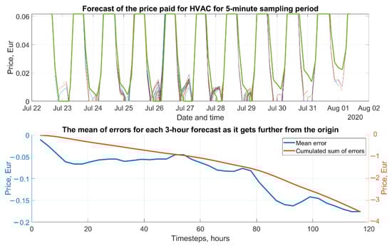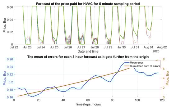 Uncertainty in the weather forecast then leads to uncertainty in the energy demand prediction. We tested the prediction abilities of the model on weather forecast data between 22 July and 30 July 2020. The absolute mean for each 3 h forecast was around 0.1 and 0.2 EUR, which made 8 EUR uncertainty on the whole forecast horizon of 5 days. The non-absolute pricing error showed that in the period between 22 July and 30 July 2020, the energy demand predictions tended to be overestimated. The cumulated sum of the non-absolute means was −3.5 EUR.