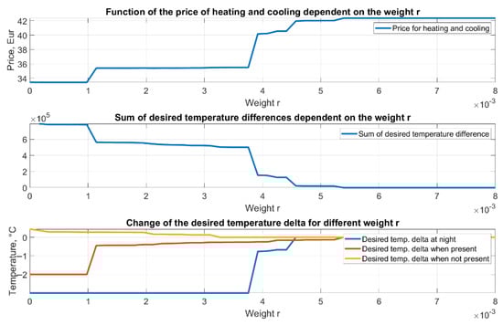 The optimization calculates Tdesired_delta so that the objective function in (13) is minimized. Two scenarios have been considered: one in which the value of Tdesired_delta is constant for the whole forecast horizon (one variable for the optimization problem), and another in which there are three values of Tdesired_delta used at different times each day (three variables for the optimization problem). These times reflect the presence of the residents inside the home. The value of f is calculated for the whole forecast horizon. If r is equal to 0 then the resulting change in the desired temperature corresponds to minimizing the price on the forecast horizon, so the optimization becomes a parametric optimization instead of a multi-objective optimization. Such a case shows the maximal potential for a decrease in price on the forecast horizon while the optimization is constrained to finding one or three values of Tdesired_delta_k.