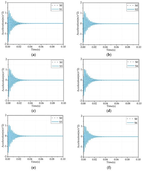 Acceleration response signals of intact structure and damaged structure. (a) Working scenarios S0 and S1. (b) Working scenarios S0 and S2. (c) Working scenarios S0 and S3. (d) Working scenarios S0 and S4. (e) Working scenarios S0 and S5. (f) Working scenarios S0 and S6. (g) Working scenarios S0 and S7. (h) Working scenarios S0 and S8.