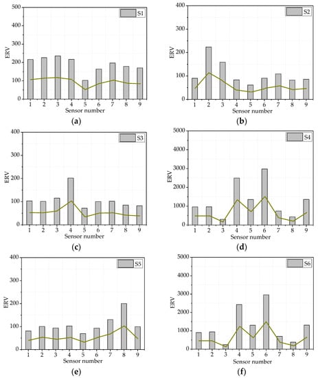 Figure 7 shows the ERV of the eight types of damage scenarios under the damage degree of 15%. It can be seen from the figure that the structural damage will have a certain impact on the ERV value. Taking the second unit damage in a single damage scenario as an example, the wavelet packet frequency band ERV varies greatly at the positions of first and second units, which can preliminarily judge the approximate location of the damage. Compared with other units, the energy released is also more. Similarly, when the damage occurs at other element locations, the damage index of the nearby element changes significantly, but when the damage occurs at the first and tenth unit positions at the support, the change of ERV of the mid-span unit is also severe and unstable.