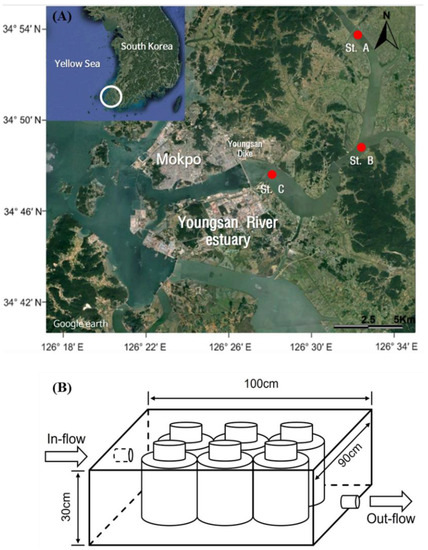 Sampling stations in the freshwater zone of the Yeongsan River estuary (A) and incubation bath (B) used in the mesocosm experiments to simulate the natural environments by circulating estuarine water inside the bath using an electric pump. Two baths were interconnected for the experiments.