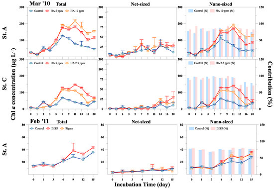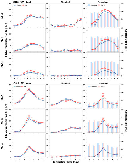 Phytoplankton biomass measured as fractionated chl a was stimulated by HA addition (Figure 2, Figure 3 and Figure 4 and Table 3). In May and August 2009, total and nanosized chl a increased significantly (p < 0.05) when HA was added, except nanosized chl a at St. B in May and St. C in August (Figure 2, Table 3). The net-sized chl a showed no significant increase during this period.