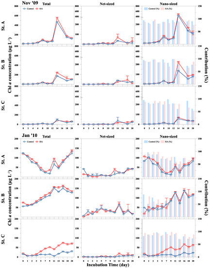 Size-fractionated chl a concentration (µg L−1) and contribution percentage (%) of nanosize class during the mesocosm experiments for water samples collected at St. A, B, and C in November 2009 and January 2010.