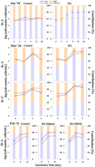 The abundance of total cells and diatoms increased significantly (p < 0.05; Table 4) with HA addition at St. C in January 2010, when diatoms dominated the phytoplankton community in situ (92%; Table 3). In particular, the abundance of Stephanodiscus sp. (Bacillariophyta), a dominant species among the diatoms (82%), increased significantly (p < 0.05; Table 4), whereas the abundance of other species did not increase (Figure 5). There was no significant increase in any of the phytoplankton groups or in Stephanodiscus sp. with HA addition between March 2010 and February 2011.