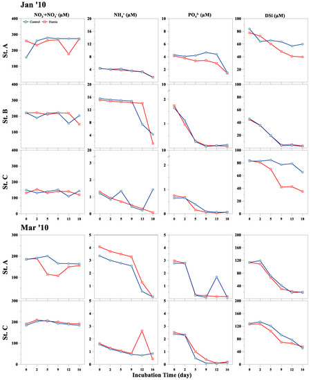 Nutrient levels were examined during the incubation period in January and March 2010 (Figure 6). NO2− + NO3− did not change significantly during incubation, whereas other nutrients, including NH4+, PO43−, and DSi, decreased over time. The preference of NH4+ to NO2− + NO3− was inferred from the different patterns of depletion. Depletion of DIP (PO43−) was apparent and initiated earlier than that of other nutrients during the experiment. However, no significant difference in nutrient measurement was observed between the HA treatment and control groups (Table 4). DSi levels showed a significant decrease in the HA treatment compared with the other nutrients and relative to the control groups, especially at St. C.