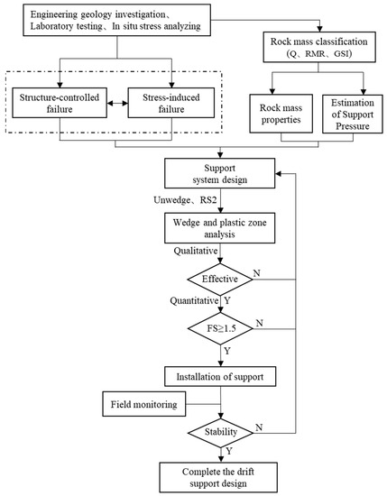 In the study area, the mine experience analogy method can maintain the stability of drifts during the shallow mining period. After mining into the deep, drift support can encounter many challenges. In this paper, a systematic approach of drift support design is proposed for deep hard-rock mines: (1) We collected basic information including engineering geology investigation, laboratory data, and in situ stress conditions. After the drift was excavated, a survey line was laid along the face of the drift, the geometrical parameters of the structural surfaces intersecting the survey line were measured, and the geological features were described individually. Rock samples were collected in the field for laboratory testing to determine the physical and mechanical properties of intact rocks. In situ stress conditions in the study area were obtained using the hydraulic fracturing method and stress-relief method. Field observations were conducted to determine which kind of failure occurs in the rock mass. (2) The rock masses were classified based on Q, RMR, and GSI and the collected basic data, and the discontinuities of the drift rock masses were analyzed using Dips software. (3) The rock mass parameters required for the numerical simulation and the support pressure required for the support design were calculated based on the rock mass classification results. (4) Preliminary support system design and the wedges that caused structural damage in the drift were analyzed using Unwedge software. The plastic zone and stress state around the drift were analyzed using RS2 software. (5) The factor of safety was used to evaluate the reliability of the drift. (6) If both the numerical simulation results and the factor of safety indicated that the support system was effective, field support installation and displacement monitoring were carried out to further evaluate the reliability of the support system. Figure 1 shows the process of drift support design.