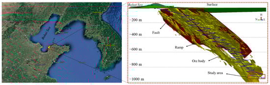 The Sanshandao Gold Mine is located on Jiaodong Peninsula, China (Figure 2). The mining depth of Sanshandao Gold Mine has exceeded 1000 m, and it is also the only undersea gold mine in China. The tectonic position is in the west of the North China Plate, with the Yishu Fault Zone to the west, Jiaolai Basin to the south, and Longkou Downfaulted Basin to the north. The mining area is characterized by the development of brittle fracture structures, and the main trends are northeastern and northwestern, which constitute the basic structural framework of the area (Figure 3). The ore body is located in the Sanshandao Fault Zone, and the lithology is mainly beresitization cataclasite, beresitization granitic cataclasite, and beresitization granite, and the hangingwall and footwall lithology are mainly beresitization cataclasite. The ore body thickness ranges from 0.59 m to 42.36 m, with an average of 7.24 m. The maximum length of the engineered strike is 2070 m, and the maximum depth of the engineered inclination is 1402 m. The ore body has an overall strike of about 20° and a dip angle of 25° to 59° the towards southeast, with an average dip angle of about 42°. Mining transport drifts are excavated in the footwall, and the drill and blast mining method severely damages the drifts.