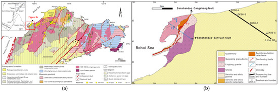(a) Simplified geological map of the Jiaodong Peninsula [35]. (b) Geological map of the Sanshandao Gold Mine [36].