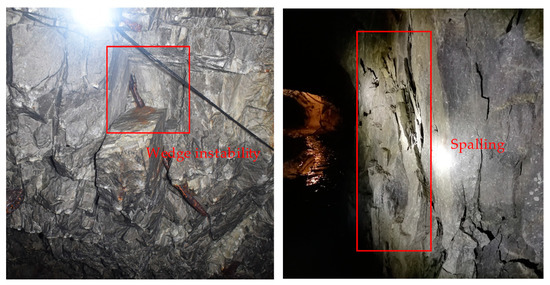 The field observation (Figure 4) revealed that the stress-induced failure in the study area mainly occurred on both sides of the drift. The intact rock body was spalling under tangential concentrated stress, which was in the form of thin pieces or plates. There was still some structural failure mainly in the drift roof, and the wedge formed by joints or cracks collapsed after excavation and unloading.