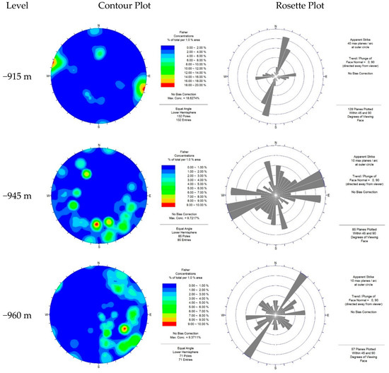 Geotechnical hazards in the study area frequently occur after reaching −800 m, especially at the −915 m level, including wedge instability, rock plasticity zone development spalling, etc., which affect the safety of workers and the production of mining. Therefore, engineering geological investigations were carried out in the drift at the −915 m level and below the −945 m and −960 m level. The −915 m investigation found 132 discontinuities; the −945 m investigation found 85 discontinuities; and the −960 m investigation found 71 discontinuities. The investigated discontinuities were analyzed using Dips software in stereographic projection (Figure 5). The −915 m, −945 m, and −960 m levels exhibited three joint sets, four joint sets, and four joint sets, respectively. Discontinuity values for Q ratings and RMR ratings were obtained based on the engineering geological investigation results combined with the quantitative RMR charts proposed by Bieniawski [25] and the quantitative Q charts proposed by Barton et al. [23]; these are presented in Table 1.