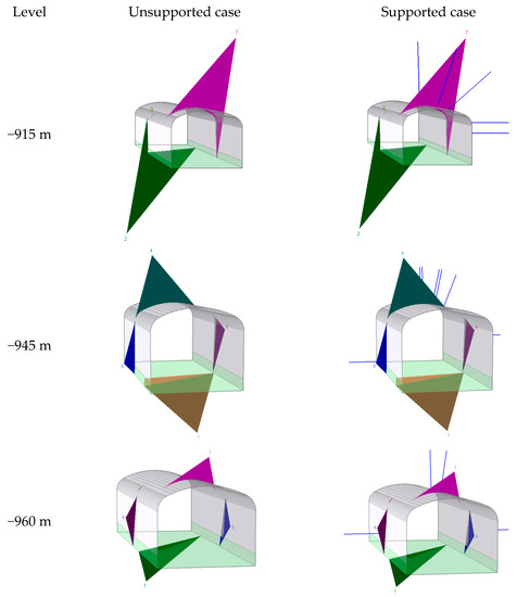 All floor wedges and the lower right wedge located in the −915 m drift were stable. Other wedges were assumed to be potentially prone to failure due to the factor of safety (FS) being lower than 1.5. In order to stabilize these wedges, rock bolts of 2.2 m length or 4.4 m length and 100 mm thick shotcrete were installed during the excavation. A wedge that is too small in size, such as −915 m 8# wedge, can fall down manually and then be supported. During the routine excavation, it is necessary to identify potential wedges using the Unwedge software to ensure construction safety.