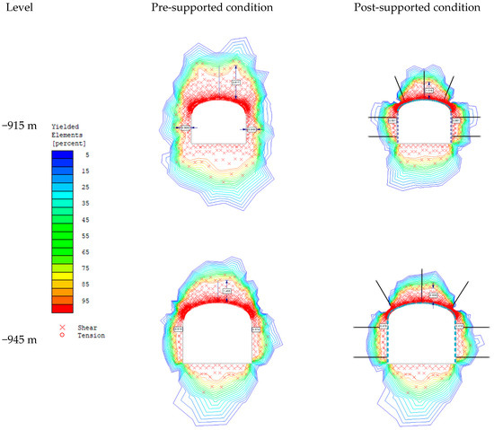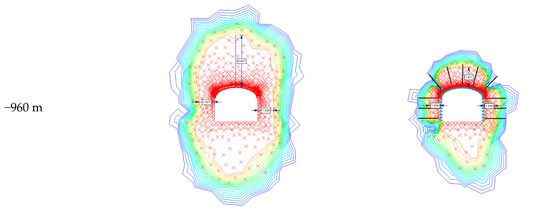 Figure 8 shows the plastic zone at each study area. The unit weight of the rock mass was 2.75 t/m3. The strike length of the plastic zone was determined by the row spacing of the support system, and the weight of the damage zone was carried by the support system. A factor of 1.5 to 2.0 is usually considered adequate for permanent excavation. The FS values of −915 m, −945 m, and −960 m were calculated as 2.79, 3.32, and 2.05, respectively, which all satisfied the requirements of permanent support. This factor can provide guidance for support system stability.