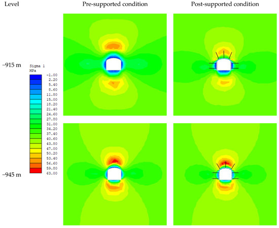 RS2 software was used to analyze stresses, deformations, and induced plastic zones of surrounding rock. This program is based on finite element analysis using the Hoek–Brown failure criterion. The drift section is built as a three-core arch. The sectional dimensions of the −915 m, −945 m, and −960 m levels are 4.3 m × 3.5 m, 4.6 m × 4.1 m, and 4.3 m × 3.5 m, respectively, with an expansion factor of “3” for the fixed external boundary. Graded mesh with three-node triangular elements was chosen for mesh discretization and to increase density surrounding the drift. The constant field stress type was taken from in situ stress values presented in Section 3.2. Then, the drift section was analyzed and modeled, and the geotechnical parameters are shown in Table 5. Different input parameters were used before and after the support was implemented. The plastic zone was analyzed for the three study areas (Figure 8). Overall principal stress analysis was also performed for average rock mass (Figure 9). As per the instruction received from the client, the standard pattern of grouted rock bolts, 32 mm in diameter and 2.2 m in length, was used in this software. After the installation of support system, the radius of the influenced plastic zone was reduced.