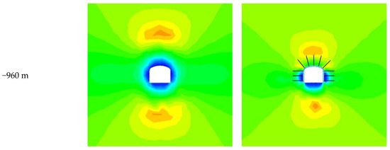 From the comparative analysis of the principal stress before and after the support, as shown in Figure 9, the hot-color high-stress zone in the surrounding rock was far away from the drift roof before support, and after being supported, the hot-color high-stress zone shifted closer to the drift roof, indicating that the bearing capacity of the drift surrounding rock was significantly increased after being supported. The area of the cold-color low-stress zone in the drift surrounding rock was significantly reduced after support, especially in the roof of the drift, which also indicated that the unloading damage zone in the drift was reduced. The increase in the bearing capacity and the reduction in the damage zone of the surrounding rock indicated that the support system was effective in improving the stress state of drift surrounding the rock.