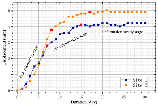 Two displacement sensors with a spacing of 3 m were installed on the −960 m drift roof for a period of one month (Figure 10). Sensors were installed immediately after the drift support. The monitoring results indicated that the displacement of monitoring site 1 increased rapidly in the first week after the excavation, then the deformation rate slowed down in the second week and was in a steady state after half a month with no obvious displacement; monitoring site 2 exhibited a near-linear and rapid increase in displacement on the eighth day, then the deformation rate slowed down from the eighth day to the seventeenth day and reached stability afterwards. The final displacement values of the two monitoring sites were 4.2 mm and 4.9 mm, respectively. Figure 11 reveals that the drift deformation occurred in three stages: fast deformation stage, slow deformation stage, and deformation steady stage. This indicates that the support system worked well to slow down the deformation of the drift and was able to effectively control the failure of the drift.