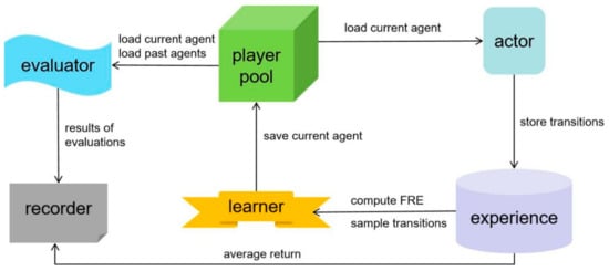 Combined with the aircraft model, missile model, reward design, and FRE-PPO algorithm, an air combat agent training framework based on FRE-PPO is proposed. The agent training framework consists of six parts: actor, experience pool, learner, player pool, evaluator and recorder. The framework is shown in Figure 2.