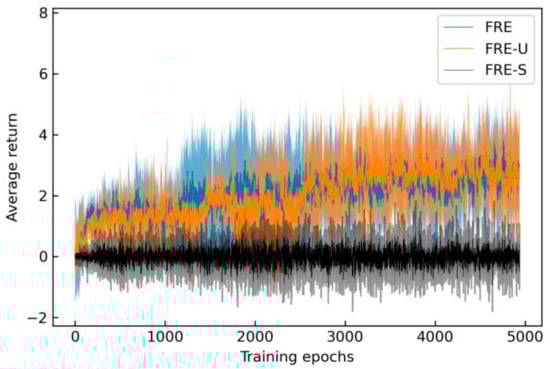 In this section, five methods are used for experiments: FRE, FRE-U, FRE-S, GAE and DSR. FRE stands for using FRE in the objective function and collecting samples according to FRE, FRE-U stands for using FRE in the objective function and collecting samples randomly, FRE-S stands for using FRE in the objective function without intermediate rewards and collecting samples according to FRE, GAE stands for using GAE in the objective function, DSR stands for using DSR in the objective function. In each iteration, the evaluator records the evaluation results of the method. Figure 3 shows the change in the average return of FRE, FRE-U and FRE-S during the agent training process. The solid line represents the mean of average returns of the five experiments, and one point is drawn on the solid line every five gradient steps. The shaded part represents the standard deviation of average returns. As can be seen from Figure 3, since agents have not yet acquired any effective maneuver policy, average returns in the early training are negative. After several times of training, the average returns of FRE and FRE-U have an obvious upward trend, while the average return of FRE-S is always around 0.