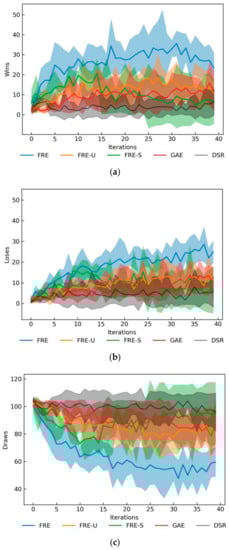 As shown in Figure 4c, the number of draws of FRE decreases obviously during training, and its amplitude is also large. The decreasing rate of the number of draws of FRE-U is faster than that of GAE, which indicates that the performance of FRE-U is better than GAE. The number of draws of FRE-S first decreased and then increased, and the number of draws of DSR is almost not decreased, which is consistent with the results in Figure 4a,b.
