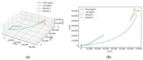 As can be seen from Figure 5a,b, because the first agent has not been trained, it maneuvers randomly, and it can be considered that the first agent cannot make effective maneuver decision-making. It can be seen from Figure 5a that the flight altitude of the first agent gradually rises with random maneuvers, and the final agent also gradually rises in order to defeat it. From the top view of the flight trajectory of the final agent, it can be seen that the final agent flies in the direction of the first agent and launches a missile, and the first agent is hit by the missile of the final agent at last, which indicates that the agent acquired how to attack its target after training of the proposed method.
