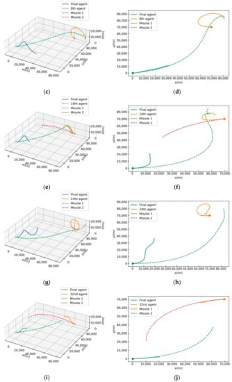 The above experiments show the statistical results of agent training, and the following experiments show the simulation results of agent training. Figure 5 shows the air combat simulation results of the final agent against the first, eighth, 16th, 24th and 32nd agents starting from the equal initial situation. The initial position of the final agent is (0, 0, 10,000), the initial yaw angle is 0°, and the initial pitch angle is 0°. The initial positions of other agents are (70,000, 70,000, and 10,000), the initial yaw angle is 180°, and the initial pitch angle is 0°. Figure 5a,c,e,g,i are three-dimensional trajectories of the final agent against the first, eighth, 16th, 24th and 32nd agents, respectively. Figure 5b,d,f,h,j are top views corresponding to the three-dimensional trajectories. In Figure 5, the solid line represents the trajectory of the aircraft, the dotted line represents the trajectory of the corresponding missile, and the two dots represent the initial positions of both sides of air combat.