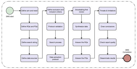 Next, we present the main phases to define the SMS protocol. The initial stage consists of determining the study’s aim and need (Section 4.1.1). Then, the RQs and PQs associated with the fulfillment of the study objective will be defined (Section 4.1.2 and Section 4.1.3). From the RQs, the search string (Section 4.1.5) will be generated to search for relevant articles in the data sources, in which the results will subsequently be filtered based on inclusion and exclusion criteria (Section 4.1.6). This process will end with validating the defined protocol (Section 4.1.7).