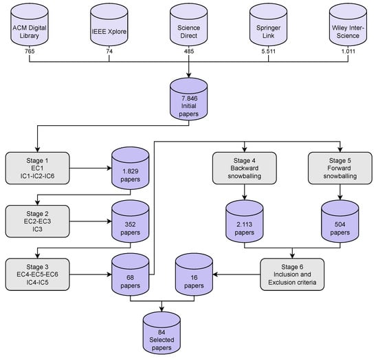 The search process begins with an automatic search using the selected data sources and the search string defined in Section 4.1.5. The goal is to obtain the first collection of articles to be distributed among the team’s researchers. Once the first collection of articles has been obtained, each researcher must independently filter each article according to the following inclusion/exclusion criteria, which allow us to determine whether an article is relevant to our study or not. This process is determined by reviewing only each article’s title, abstract, and keywords. Inclusion criteria (IC) and exclusion criteria (EC) will be applied to each selected article. These criteria are shown in Table 8 and Table 9. To avoid excluding relevant articles, we will occupy a first snowballing search review according to the guidelines proposed by Wohlin [42]. The search range will be extended by reviewing for every selected article the references of each article (backward snowballing) and the citations obtained by the articles (forward snowballing).