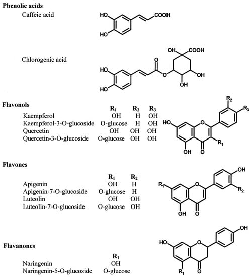 A group of researchers [] demonstrated in 1998 that flavonoids are responsible for the cholagogue activity of extracts from sandy everlasting flowers. In general, the inflorescence of H. arenarium contains three types of flavonoids: flavonols, flavones, and flavanones [,] including 39 compounds (Figure 3). The main compounds in sandy everlasting are the chalcone isosalipurposide and the flavanones naringenin and naringenin-5-O-glucoside [,]. Flavonoids are one of the most abundant and widely spread groups of phenolics in plants, with many biological and pharmacological effects [], some of them because of their phenolic structure, including antioxidant properties and the inhibition of processes mediated by free radicals [].