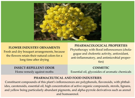 Helichrysi flowers retain their natural color even after drying, which makes this plant useful in aromatherapy and horticulture for designing floral ornaments (Figure 4). Moreover, the flowers were used for dying home-made fiber fabrics to obtain a bright and durable yellow color [].