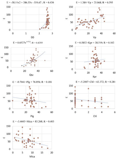 Moreover, several regression equations were developed using data from lab analyses. The applied method of developing these regressions was relating a specified spectrum of data from simple index tests, including Schmidt hammer [,], ultrasonic velocity [,], point load strength [,], and porosity [,,], to Young’s modulus, E. While some previous studies stated that the traditional statistical methods lack the power of generalizability [,], this present study endeavors to examine this controversy rigorously.