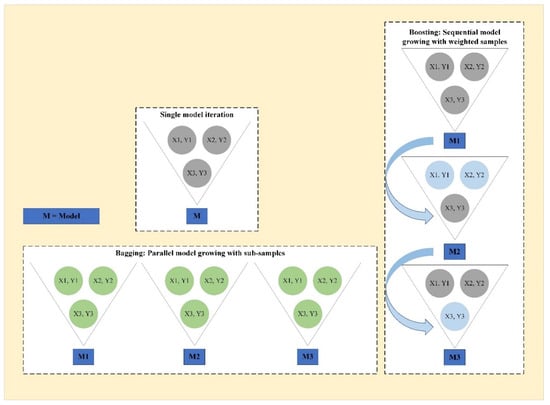 To remedy the issues with DTs stated above, ensemble approaches can be employed. The same as the application of the ensemble approach in ANN, the ensemble approach integrates various DTs to create a more suitable predictive performance compared to a single DT. Random forest (RF) [] and extreme gradient boosting tree (XGBT) [] are well-known bagging and boosting techniques, which use a CART model for creating a stronger learner.