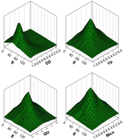 Before applying boosting and bagging techniques to data, an input selection has been conducted. As previously mentioned, this study adopted a likelihood ratio test for selecting the most relevant inputs for predicting the E. The candidate inputs included DD, Vp, Qtz, Mica, Chl, Plg, and Kpr. This test then selected Vp, Qtz, DD, and Mica, respectively, as the most relevant E prediction inputs. Figure 4 provides a series of 3D density diagrams of the selected variables and shows the frequency distribution of pairs of each input variable and the target variable (E). The inputs selected in this step will be used to develop the standard, boosting, and bagging models.