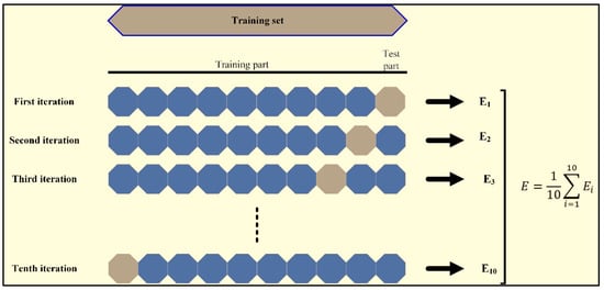 This study developed six models, including standard ANN, standard DT (CART), bagged ANN, boosted ANN, bagged DT (random forest), and boosted DT (extreme gradient boosting tree). These models are developed using the transformed and selected inputs in the previous steps. For developing these models, a 10-fold cross-validation technique was employed to avoid overfitting. In k-fold cross-validation, smaller collections are created by dividing the training dataset into k folds. Then, the training data, including k-1 folds, are trained. The unused part of the data is employed to validate the resulting model. Next, the mean of the values calculated in the circle is adopted to report the k-fold cross-validation performance. Figure 5 shows the process of a 10-fold cross-validation used in this study.