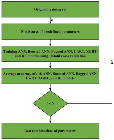 The team behind this research employed various hyperparameters controlling the learning process to develop these models. They also used a grid-search strategy to optimize these parameters. The process of a grid-search in this study is shown in Figure 6. As previously mentioned, the single DT developed in this study is CART. Its optimized hyperparameters included levels under root = 5; highest replacements = 5; lowest variation in impurity = 0.0; lowest records in parent branch = 2%; and smallest records in child branch = 1%. Concerning XGBT model, the optimized hyperparameters were: boost rounds = 10; maximum tree depth = 6; minimum child weight = 1.0; objective = reg:linear; sub sample = 1.0; Eta = 0.3; Colsample by tree = 1.0; Colsample be level = and 1.0; Lambda. For RF, the best hyperparameters comprised: number of trees to build = 10 and minimum leaf node size = 1. Concerning the standard ANN model, the hyperparameters were: NN model = MLP; hidden layer 1 = 1; hidden layer 2: 0; and overfit prevention set = 30%. For boosted and bagged models: number of component models for boosting = 10 and combining rule = mean.