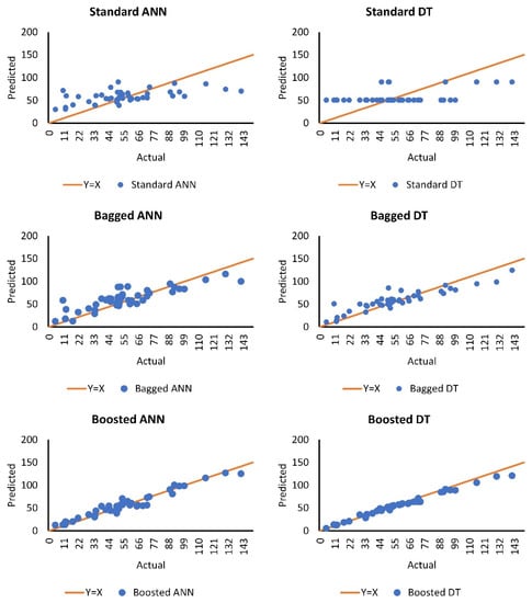 Table 4 and Table 5 show the performance of each model developed in this study. Concerning standard models, the ANN possessed a better R and MAE than the CART model. RF outperformed its peer, ANN, when the bagged models are concerned. For boosted models, XGBT had a better performance than the boosted ANN. Among all models developed in this study, boosted models outperformed the bagged and standard models. Finally, the boosted DT, which, in fact, was an XGBT, outperformed other models developed in this study.