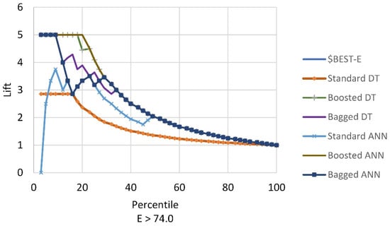 Figure 8 shows the lift chart of the models developed in this investigation. In this chart, elevated lines show better models, especially on the left edge of the graph. As can be seen, boosted DT (XGBT) line was higher than the others. This line also was more stable compared to other lines.
