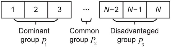 As indicated in Figure 1, this paper classifies all particles according to the natural selection rule. The first three particles with the best fitness are the dominant group P 1 , the disadvantaged group P 3 is the last three particles with the worst fitness, and the rest are the common group P 2 . P 1 should have more development space, while P 3 should learn from the dominant group, and no mutation is operated on P 2 .