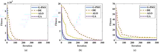 We selected the Sphere (A1), Ackley (A2), and Rastrigin (A3) functions to test the performance of the G-PSO algorithm. The Sphere function can test the local search ability of the algorithm and the Ackley and Rastrigin functions can test the comprehensive search ability of the algorithm [19]. The above three optimization test functions are optimized by DE, ALO, GA, and G-PSO algorithms, respectively. In the DE algorithm, the scaling factor is 0.5 and the crossover rate is 0.3. The coefficient of ants’ random walks in the ALO algorithm is 2. In the GA, the crossover rate is 0.75, and the variation rate is 0.01. In the G-PSO algorithm, c p 1 and c g 1 are both 0.8, c p 2 and c g 2 are both 1.7, ω m i n is 0.4, and ω m a x is 0.9. The relevant parameters are shown in Table 1.