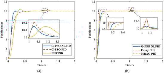 Figure 8. Simulation response curves of different controllers: (a) Comparison of PID and NLPID controllers based on G-PSO algorithm, (b) Comparison of G-PSO NLPID, Fuzzy PID, and MRAC PID.
