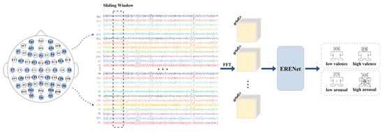 The proposed emotion recognition framework based on multi-band EEG topology maps is shown in Figure 1. Firstly, the multi-channel EEG signal sequences are acquired and preprocessed mainly through removing the baseline signals and augmenting the data. Secondly, the spectral power of the theta, alpha, beta, and gamma bands is extracted using FFT, and a 2D topology map corresponding to each band is created. Then, the corresponding four EEG topology maps are used as the input of ERENet to learn the emotion generation modes and emotion evaluation.