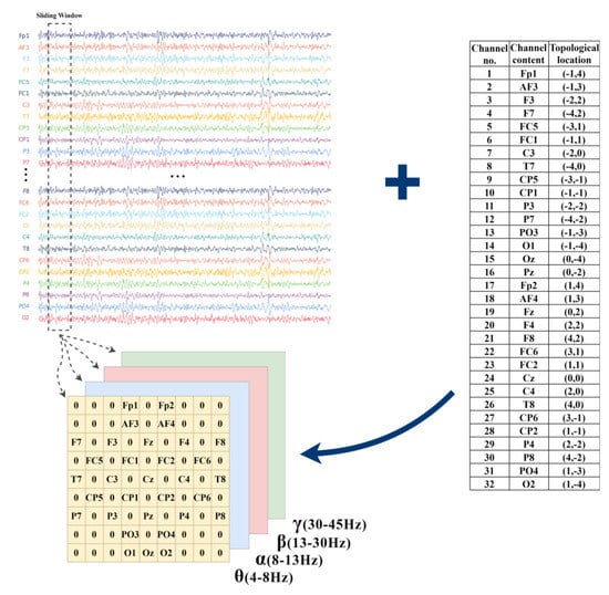 However, most emotion recognition methods at present are limited to recognizing emotional states from time domain features, frequency domain features, and time-frequency domain features of EEG signals. Little research has been conducted on the spatial topological characteristics and frequency band characteristics of multi-channel EEG signals. There are some methods [32,35,36] that try to learn spatial features from a multi-channel EEG time series that is a 2D matrix, with one dimension representing the electrodes and the other dimension representing the time series. The EEG time slices only aggregate all of the electrode measurements together, and the correlation between EEG changes in different brain regions cannot be mined from them. Jones et al. [37] found that the left hemisphere is more active in positive emotions and the right hemisphere is more active in negative emotions, which has also been confirmed by many studies [38,39]. Huang et al. [40] pointed out that for valence recognition, prefrontal asymmetry and parietal asymmetry are present in the alpha band; temporal asymmetry is observable in the gamma band; and for arousal recognition, prefrontal asymmetry in the alpha band and temporal asymmetry in the gamma band are present. The spatial information of EEG signals and the characteristic information of each frequency band contain significant information related to emotional states, which is of great significance for the discrimination of emotional states. Therefore, how to combine the frequency features of EEG signals with spatial information and frequency band characteristics is a key problem.