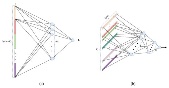 In the traditional classification layer as shown in a, the total number of parameters is from the feature vector flattened into a 1D vector, then through the fully connected layer to the output layer. The number of parameters of the weighted classification module is as shown in Figure 6b. represents the number of feature maps’ output by the previous module and .