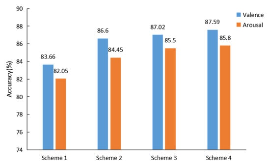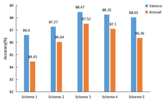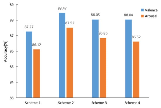 It can be seen from the experimental results in Figure 8 that the accuracy of scheme 3 with the convolution kernel of 5 × 5 is higher in these five groups of schemes. Although the 3 × 3 convolution kernel has more extensive applications in the field of computer vision, it is not suitable for EEG feature extraction due to the sparsity of 2D EEG signals, and a larger convolution kernel can often mine more correlations between channels and learn the features of EEG signals more comprehensively. In the last four groups of schemes, scheme 3 achieves a better recognition performance. Therefore, the size of the convolution kernels is set to 5 × 5 in the group convolution layer of module 1 and module 2.