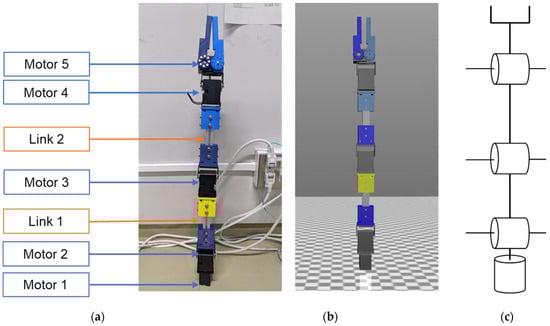Robot arm configuration. (a) Actual robot. (b) simulation model. (c) 4 DoF representation.