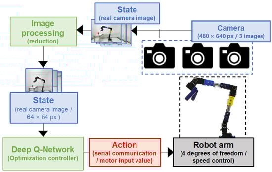Figure 5 shows the proposed system that takes in the camera images of the real or virtual space and feeds it to deep learning CNN for inference. The image of 480 × 640 pixels acquired from three cameras is preprocessed to reduce the dimensions to 64 × 64 pixels. In visual-based ML, the computational load as well as the network size increase with image dimension. Dimensionality reduction is one of the approaches adopted in RL literature to reduce model complexity while maintaining performance [,]. Next, an image from either virtual space or a real camera is passed to the training/inference deep reinforcement learning model. The model outputs discrete actions affecting (increasing/decreasing) the motor values of individual joints. The robot arm is connected to the PC via serial communication.