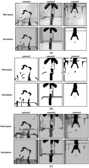 The objective of the research was to obtain image-based robot control from the simulated environment. The challenge of such an approach is how the simulated environment mirrors the actual workspace. To address this, structural design-matching was considered as explained in Section 2.2, but this does not guarantee true uniformity. To this end, we adopted image preprocessing to eliminate chromatic information and sensor noise in a bid to increase mirroring as well as achieve dimension reduction in the inference process. Image processing has been used in machine learning and fields, including sim–real transfer, as a means to enhance training [,,,].