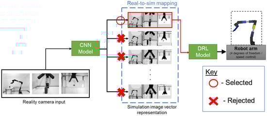 As described in the preceding section, sim–real transfer experiences the RG challenge when deployed in the real environment. The study adopted a mapping strategy that searches for patterns in real space that best correspond to the virtual space. The premise in this approach is that the simulation DRL has been optimally trained to perform successful operations; the only hurdle is the disconnect between the two environments. The role of mapping would therefore be a go-between of observations and learnt experience. In this case, a mapping model is supplied before the DRL model to bridge the gap.