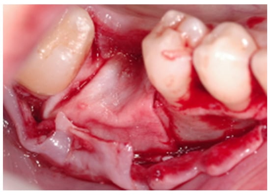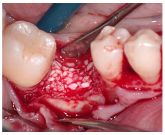 After the infiltration of a local anesthetic (mepivacaine 20 mg/mL + adrenaline 1: 100,000, Pierrel S.p.A., Capua, Italy), a crestal incision was made in the edentulous area, continuing with an intrasulcular incision on the closest adjacent teeth on both sides of the defect. Full-thickness vestibular and lingual flaps were raised, incorporating the interdental papilla of adjacent teeth in the vestibular flap. The bone surfaces were freed of soft tissues, and a series of perforations were made in the cortical bone of the edentulous area with a round bur on a surgical handpiece to promote bleeding.