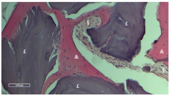 The regenerated tissues 8 months after the procedure stained with h&e. Graft particles are interconnected by bridges of newly formed bone (scale bar = 500 μm). Legend: £ Residual biomaterial, & Vital bone, § Soft tissue. Yellow rectangle, magnified in Figure 7.