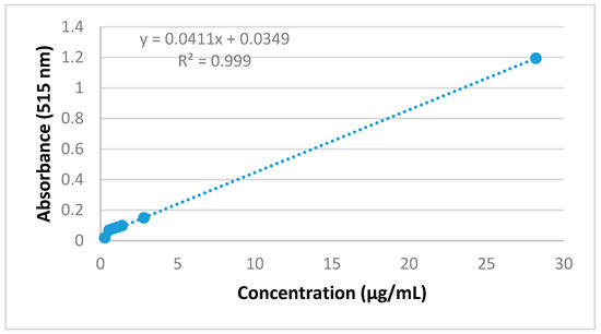 According to Figure 1, the slope of the calibration curve is 0.0411, and the intercept of the calibration curve is 0.0349. The absorbance at which the measurements were made is equal to 515 nm. Depending on the absorbance of each sample, we determined the concentration of the solutions, and then the antioxidant activity.