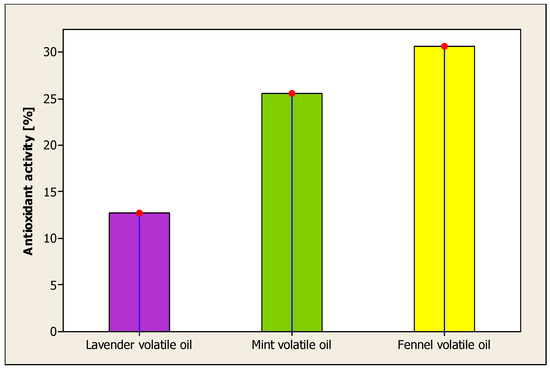 Initially, we tested the antioxidant activity of the volatile oils obtained from their extraction from plants harvested from authorized crops in Sibiu, Romania. The highest value of the antioxidant activity of pure volatile oils belongs to the volatile oil of fennel, followed by the volatile oil of mint, and the lowest value belongs to the volatile oil of lavender. Three spectrophotometer readings were taken for each volatile oil.